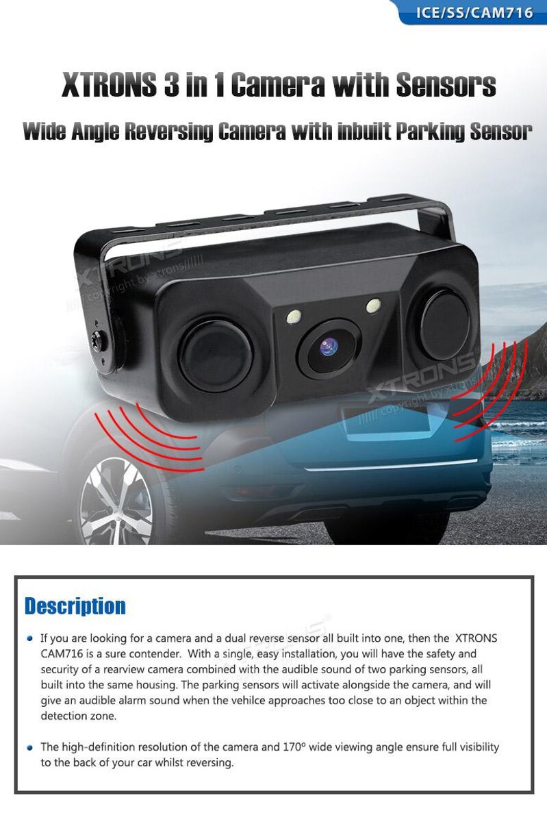 XTRONS 3 in 1 LED Allarme sonoro Telecamera posteriore 170 ° con sensore di lettura del parcheggio